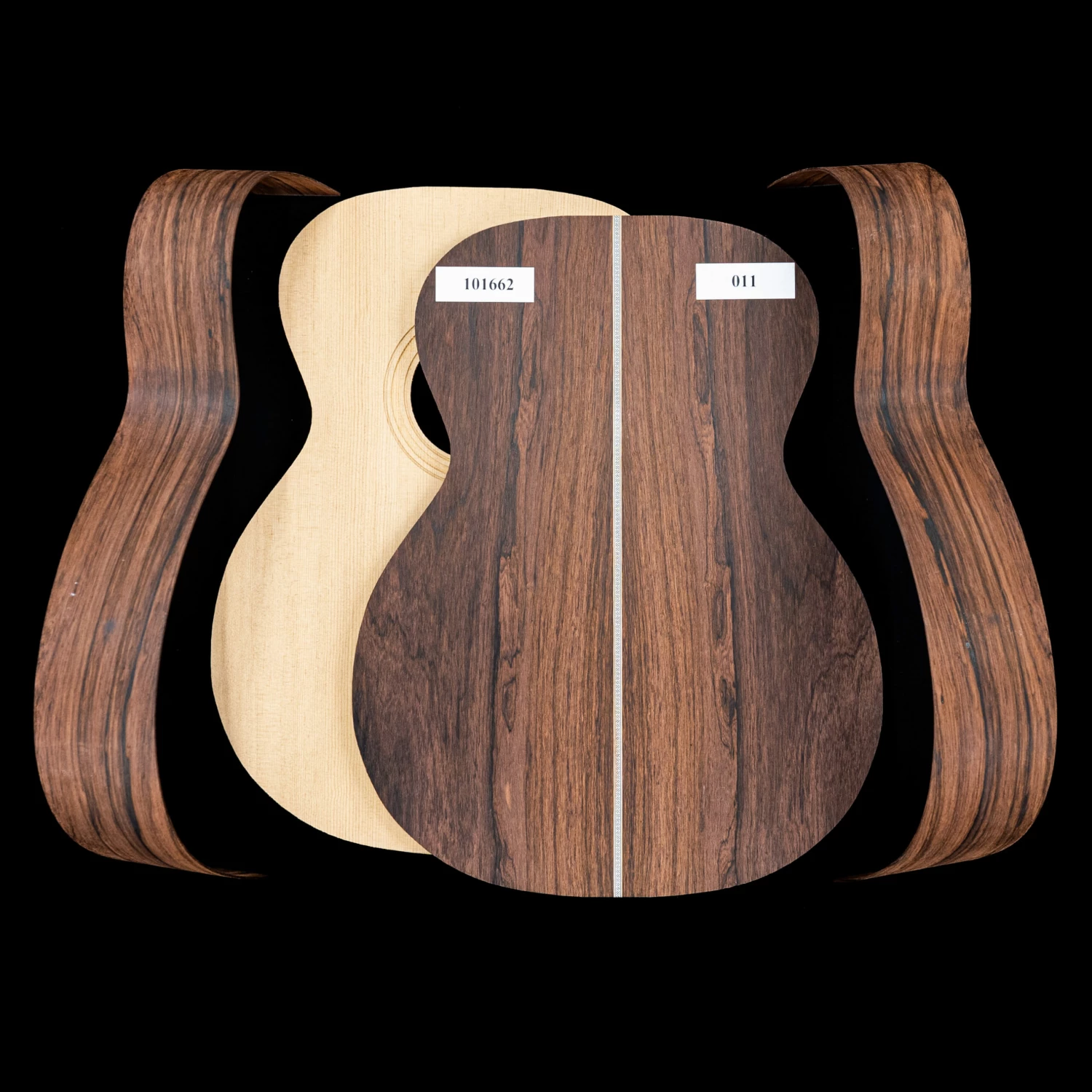 For this special kit, the Red Spruce top has been torrefied. Torrefied woods give new guitars a head start on that rich, booming “played-in” tone. The change is notable: builders have reported improved tap tone, greater strength, and lighter weight—just like a well-aged vintage guitar.Â