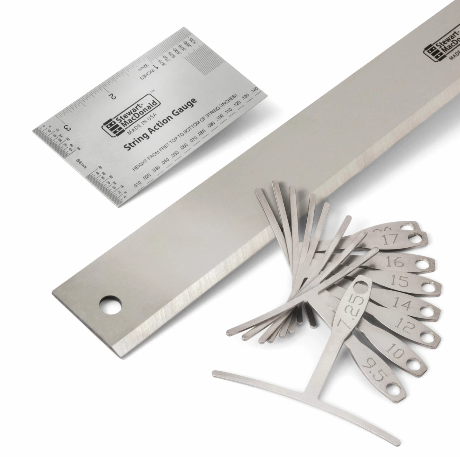 A big help for matching bridge saddle heights to the fretboard curvature, for easier playability. Accurately laser-cut from stainless steel, the set includes 9 different fretboard radii.