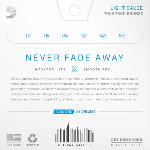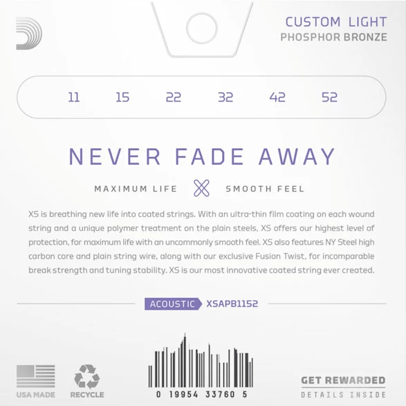 “Born from our greatest breakthrough in string innovation, XS Phosphor Bronze strings have the longest life of any D’Addario acoustic guitar string. The XS coating gives our warm, balanced phosphor bronze strings maximum life, with an uncommonly smooth feel. Made with a NY Steel core, phosphor bronze wrap wire, and Fusion Twist technology—XS coated acoustic guitar strings have incomparable break strength and tuning stability and dramatically increased lifespan.”