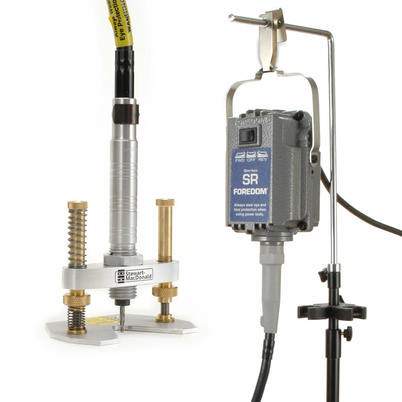 The complete set includes our versatile Precision Router Base, Foredom® Flexible-shaft Power Tool, custom handpiece, motor hanger and handpiece rest.