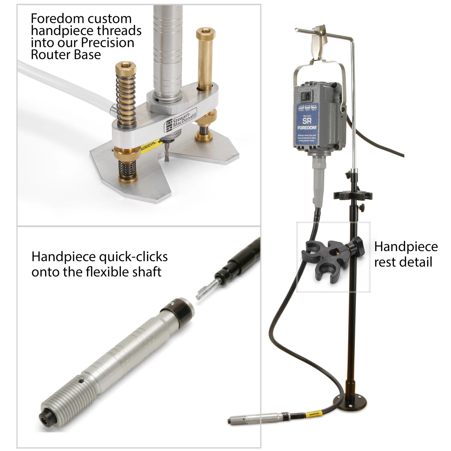 Close-tolerance accuracy: The Foredom handpiece is custom-threaded to fit Our Precision Router Base, for accurate depth control.