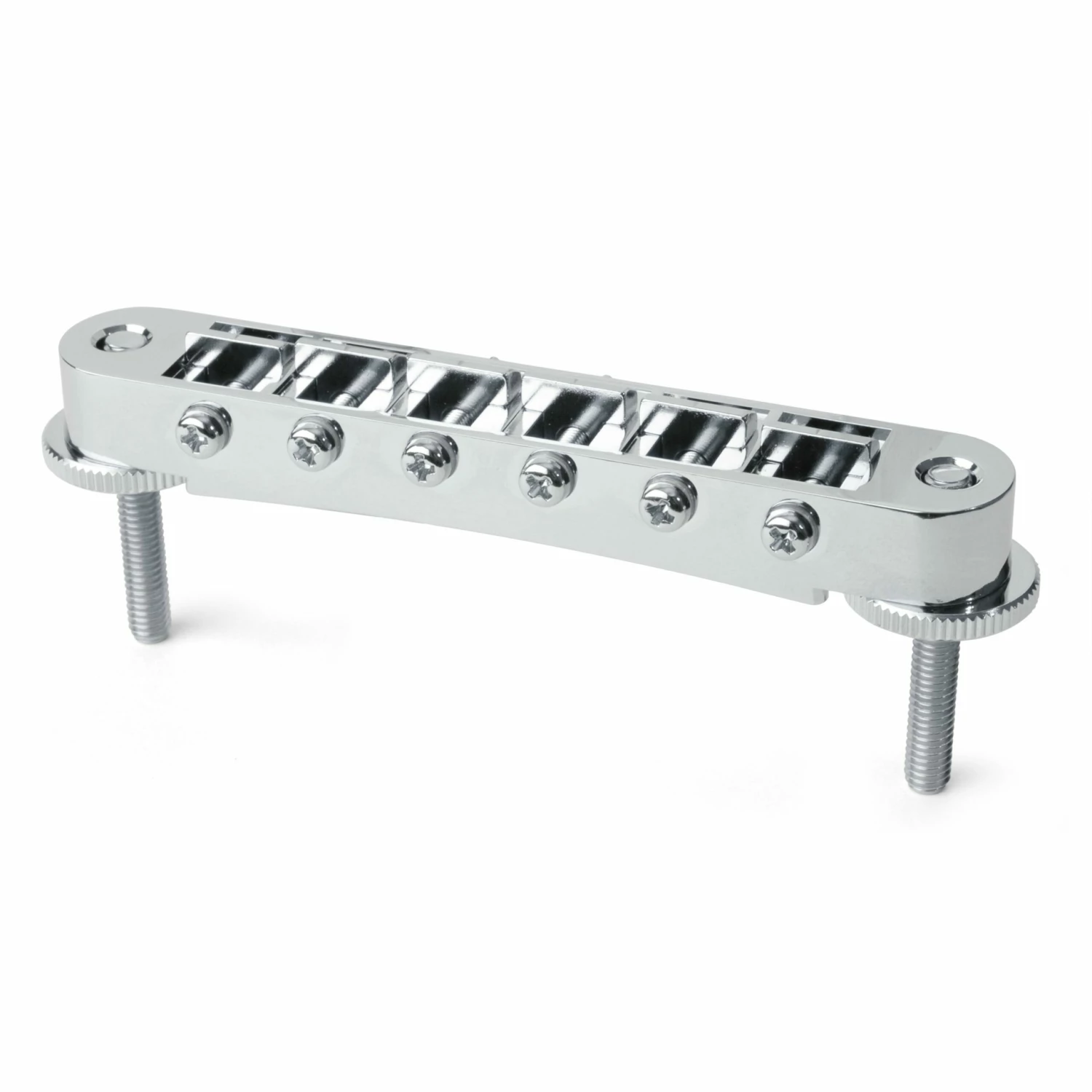 A popular modern version of the Tune-o-matic for solidbody guitar. Saddles are pre-notched with individual saddle intonation screws retained by mini hex nuts.