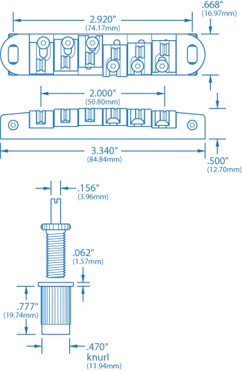 This unique post-mounted brass bridge has low-friction grooved roller saddles for smooth string return, plus advanced features for improved intonation stability. The holes for the bridge posts are elongated to allow overall intonation adjustment, and allen screws lock the bridge to the posts. The reversible roller saddles are individually adjustable for precise string intonation, and also lock to the bridge with allen screws. Allen wrench and thumbwheel mounting posts with bushings are included.