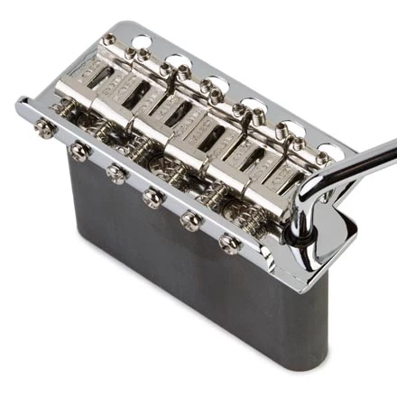 The hardware upgrades are where this kit really shines. The bridge is Wilkinson’s take on the classic Strat trem, with traditional bent steel saddles. The bridge baseplate features elongated holes so the screws won’t bind, for smooth, accurate return to pitch. The steel block also features staggered holes for an incredible feel. The Graph Tech nut keeps the guitar in tune even when you lean into the trem.